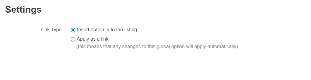 4.  If you select to "apply as a link" it will mean any changes made to the global option in the future will automatically apply to that listing. This can be helpful to avoid having to update each listing if something about that option changes regularly (for example  the option of your available list of flavours).  However, if you want to tweak some aspects of the option such as the name (e.g. Choose sauerkraut flavour 1, Choose sauerkraut flavour 2 etc) or the ordering of the option variants, then you will want to use the default "insert option in to the listing".