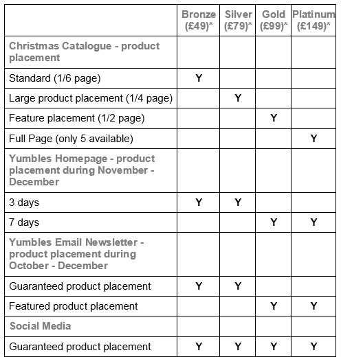If this sounds like a good opportunity, don't miss the chance to book one of our Christmas Brochure packages. Prices start from just £49 and all come with guaranteed online exposure as well as a placement in our print brochure. Over 40% of the placements have already been sold to sellers who came along to our Yumbles Meet-Up on Monday evening. Today we're opening-up the opportunity to all Yumbles sellers - places are limited, so act now. |