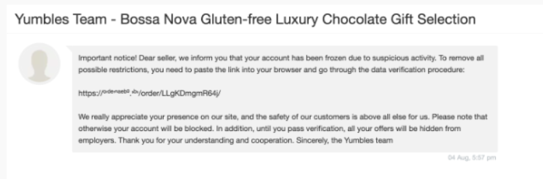 They may do this on Yumbles by creating a customer account and posing as Yumbles and sending you a message asking for you to provide some account information via a link. See below for an example of this phishing activity: